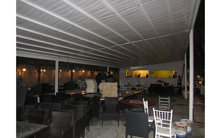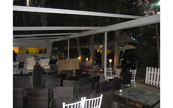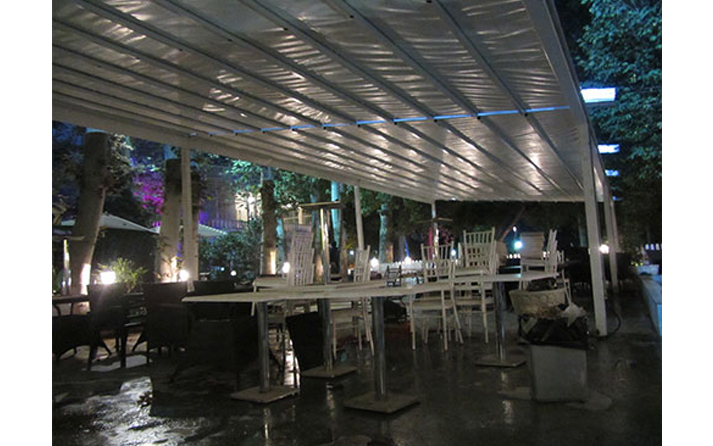 سقف متحرک رستوران لیبار موزه زمان زعفرانیه.یک تماس پیش از ظهر و درخواست بازدید آقای هاشمی یکی از شرکای کافه رستوران ریبار واقع در موزه زمان منجر به ملاقات حضوری در محل پروژه گردید. در بازدید اولیه در خواست های کارفرما مبنی بر ایجاد فضای پذیرایی به مساحت 108 متر مربع به طول 18 متر و عرض 6 متر مطرح گردید. نکته قابل توجه، محل قرارگیری این سازه بود که در فضای بیرونی موزه زمان واقع شده بود ، با توجه به قدمت تاریخی بنای موزه و قوانین موجود در این زمینه استفاده از برخی مصالح ساختمانی مانند: آجر ، سیمان و... امکان¬پذیر نبود. از طرف دیگر لازم بود که سازه به نحوی اجرا گردد که کمترین المان دیداری را ایجاد نماید و هر زمان که لازم بود بدون ایجاد کمترین خسارت به فضای باز و محوطه موزه جمع¬آوری گردد. تنها امکاناتی که در اختیار داشتیم احداث تعدادی صفحه ستون و فونداسیون محدود برای اجرای سازه یود. پس از جمع¬بندی نظرات کارفرمای محترم و محدودیت بودجه پروژه ( به دلیل استیجاری بودن فضا)، پیشنهاد این شرکت برای ایجاد سازه¬ای فلزی برای ستون¬ها و تیرها(با قابلیت جابه¬جایی)، استفاده از سقف متحرک برای پوشش سقف و استفاده از شیشه متحرک برای دیواره¬ها به کارفرما ارایه گردید و پس از تأیید کارفرما اجرای پروژه آغاز شد. سقف متحرک پارچه¬¬ای به فاصله ستون¬های 6 متری در سه واحد مجزا و یکپارچه با ارتفاع 20/3 در ستون-های پشتی و 40/2 در ستون¬های جلویی اجرا گردید. با تشکر از اعتماد کارفرمای پروژه کافه رستوران ریبار جناب آقایان هاشمی و دوایی.